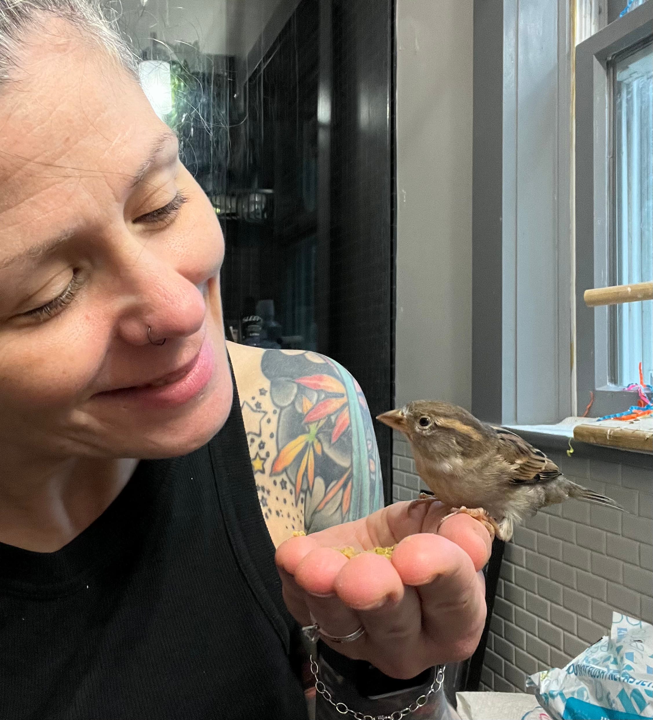 Best of all, I re-configured my social media so that I am either not on it or my feed is almost entirely birds. Not just pet birds although I have a few of those I follow. (And have! Here is a photo of me and my incredible queen house sparrow, Tock, eating from my hand.)